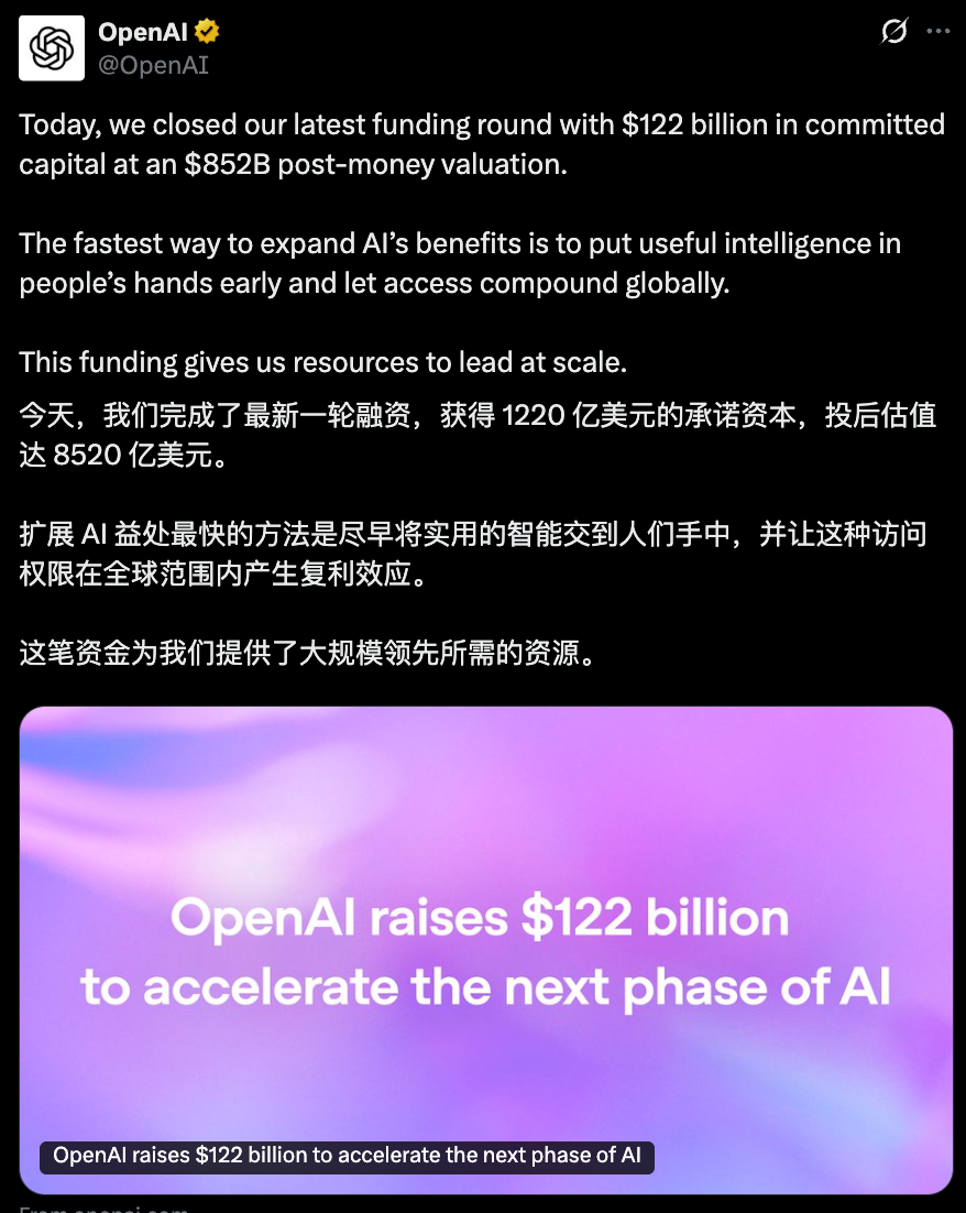 融资金额1220亿美元(约合8411.54亿人民币),投后估值8520亿美元(约合5.9万亿人民币)。