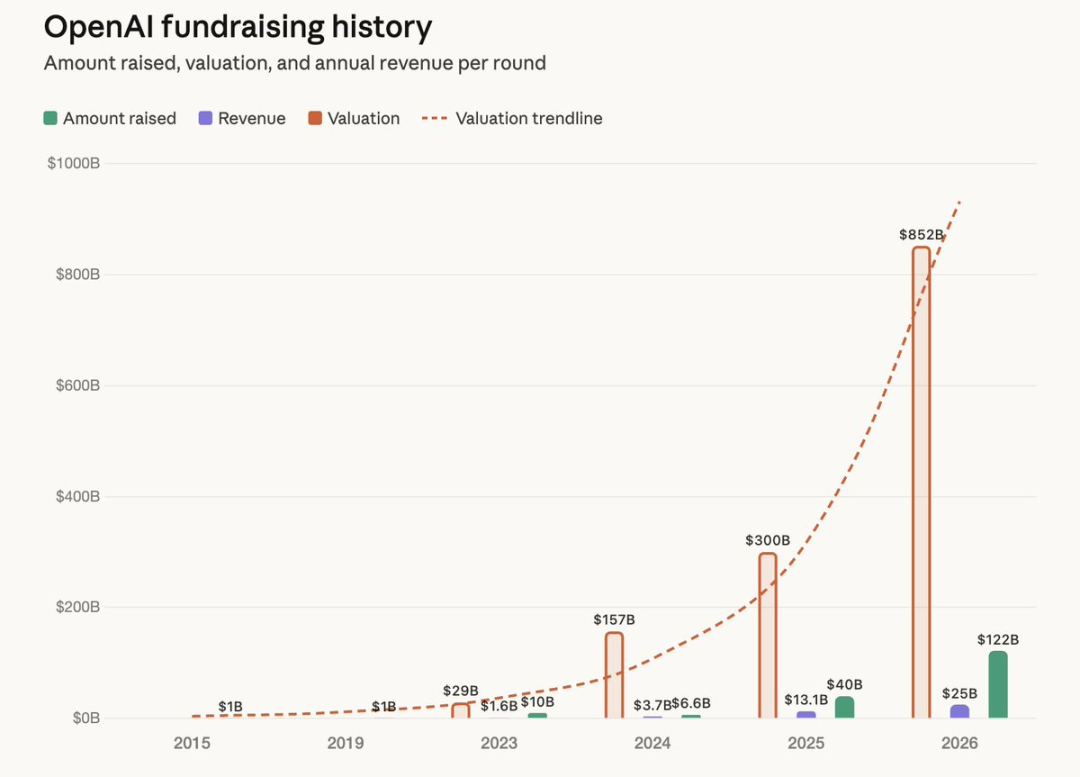 这是全球AI领域规模最大的融资之一。投后估值高达8520亿美元,标志着OpenAI已经成长为能与互联网时代巨头比肩的巨无霸。