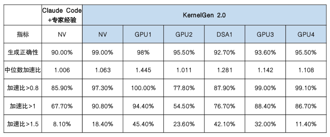 KernelGen 2.0是面向多种AI芯片的算子生成自动化平台,覆盖算子生成、基线构建、验证测试的完整生命周期,支持Triton和Triton-TLE两种语言,已适配6款AI芯片(英伟达、海光、摩尔线程、华为昇腾、天数智芯、沐曦)。在KernelGen-Bench(110个算子)上的测试结果显示:
