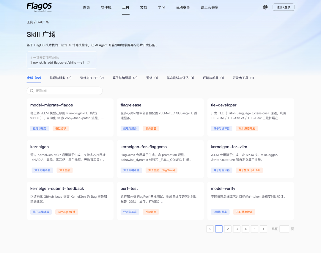 众智FlagOS社区在本次FlagOS 2.0版本发布同时,也进行了全面升级。为了让全球AI开发者在 “智能体OpenClaw” 时代很容易使用各种AI芯片平台,全新上线了 SkillHub(https://skillhub.flagos.io)。旨在为AI开发者打造一站式、面向多种AI芯片的 “最专业AI计算技能中心”,开发者可以一行命令安装全部技能: