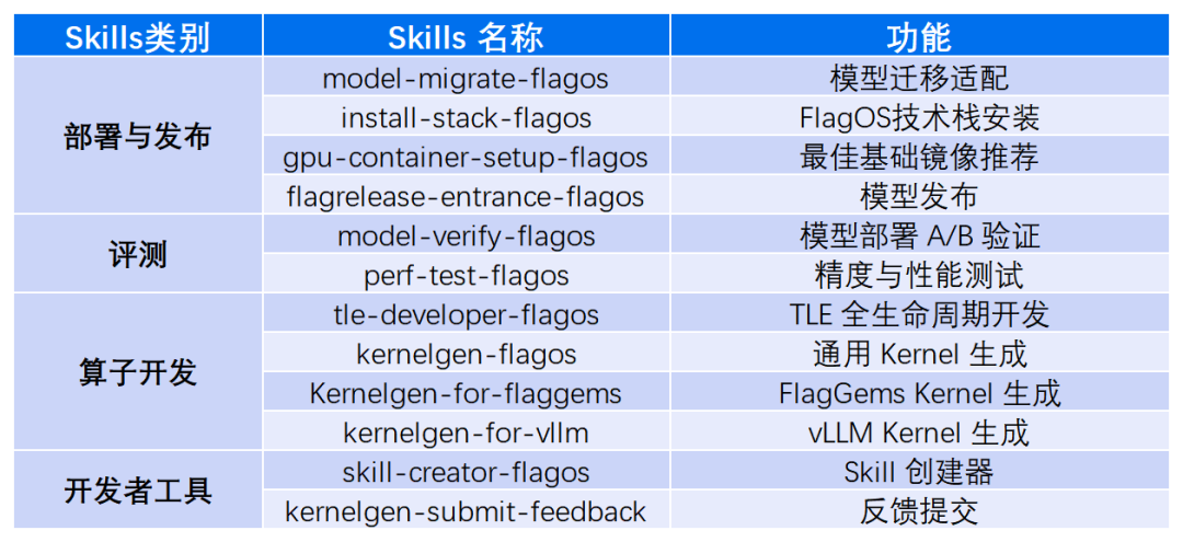 FlagOS Skills 1.0 发布,为首个为AI计算打造的专业技能库。12种Skills覆盖模型适配、算子生成、性能调优等核心场景。开发者通过自然语言即可调用,支持Claude Code、Cursor、Codex、Gemini CLI等主流AI编程工具。