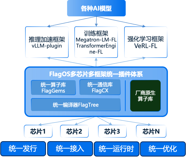 FlagOS 2.0通过FlagScale统一多芯片插件体系,向上连接多种主流AI框架,向下连接FlagOS核心能力与厂商原生能力,形成面向多元AI芯片的统一插件中枢: