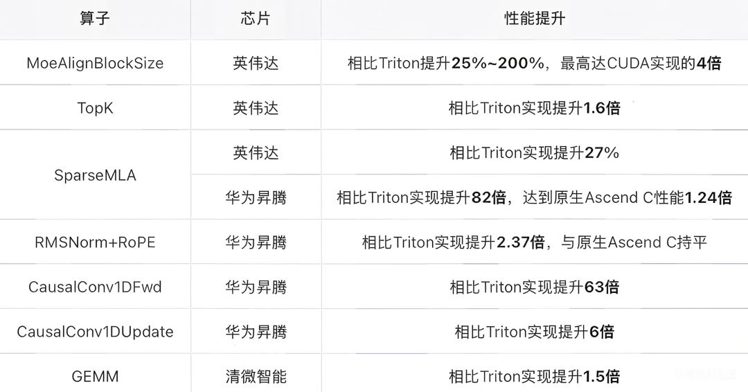 Triton-TLE目前支持31种原语,与华为昇腾、清微智能深度合作,分别在GPU、DSA、可重构计算三大代表性架构上进行验证。实测性能显著优于原生Triton,接近甚至超过各芯片原厂C语言实现: