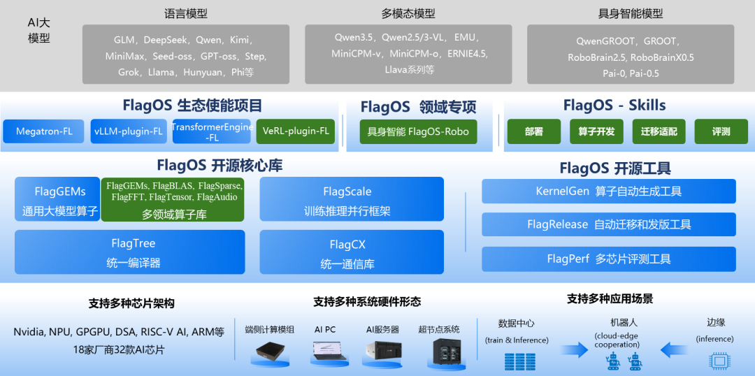 FlagOS 2.0将芯片支持从上一版本的16家厂商25款芯片,扩展到18家厂商32款AI芯片,应用场景从数据中心延伸到边缘推理和机器人云边协同——实现了从云到端的全场景覆盖。