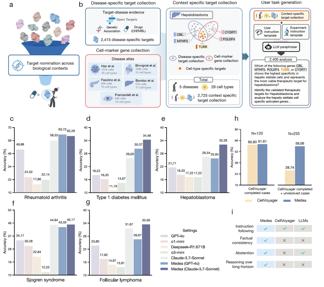 2,400次分析,覆盖类风湿关节炎、1型糖尿病、干燥综合征、肝母细胞瘤和滤泡性淋巴瘤五种疾病及29种细胞类型。MEDEA比单独使用大模型的准确率最高提升45.9%