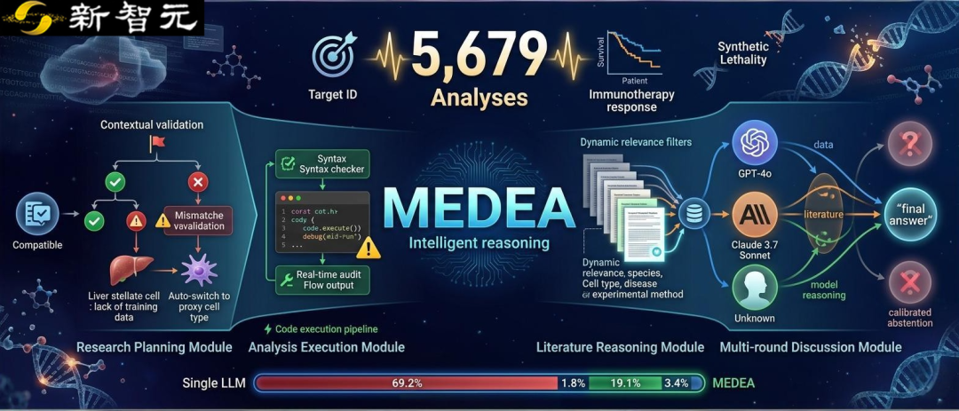 【新智元导读】生物医学AI智能体正从「能不能做组学分析」快速进入下一阶段的检验:做出来的结果,能不能撑得住真实的治疗决策?哈佛医学院Zitnik团队的MEDEA 给出了一条明确的技术路线:与其追求更强的骨干大模型,不如在分析流程的每一步嵌入验证机制。该系统在靶点发现、合成致死推理和免疫治疗响应预测三个场景上完成了5679次完整分析,消融实验证实,性能提升的主要来源不是骨干模型的能力差异,而是验证模块的有无。