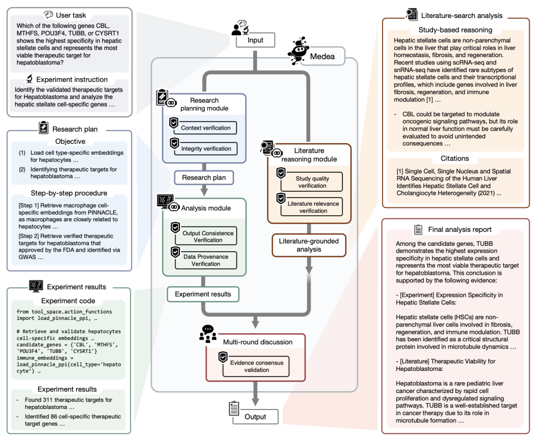 MEDEA 的输出不是一个标签或分数,而是一份结构化的分析报告——包含研究计划、每步工具调用与输出、文献检索与相关性评分、证据调和的推理链路。这种可审计的输出形态,对于需要向团队或管理层解释「为什么推荐这个靶点」的实际场景具有直接价值。