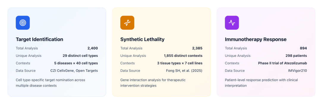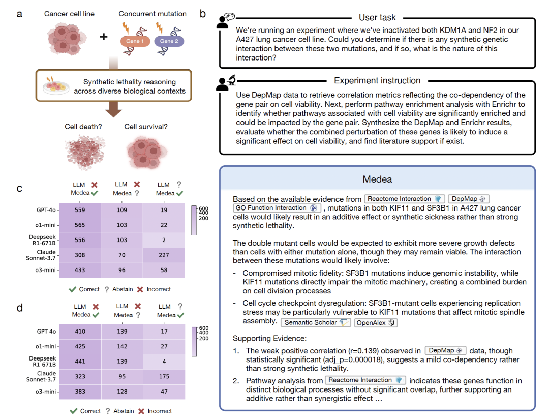 该场景下MEDEA表现出三种有价值的行为模式:在至少 323 个大模型答错的案例中给出正确判断(纠错),在 175 个大模型选择弃权的案例中给出正确答案(补漏),在 141 个大模型犯错的案例中选择弃权而非跟着错(止损)。系统整合了 DepMap 基因共依赖分数与通路富集分析,对基因对联合抑制是否会选择性杀死癌细胞做出可追溯的判断。