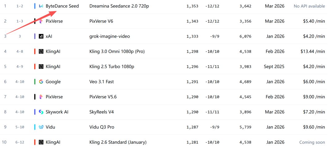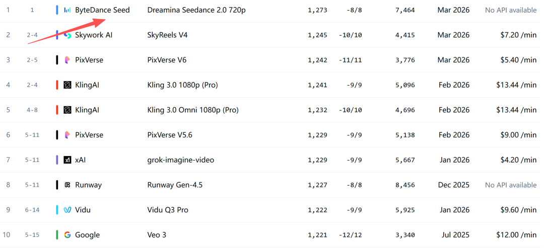 这是目前全球评测排名最高的AI视频生成模型之一。在Artificial Analysis的盲测排行榜上,Seedance 2.0拿下了文生视频和图生视频两项Elo评分的第一名。