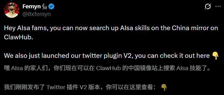Skill开发者Femyn第一时间跟进,喊话自己的用户,Alsa技能已经能在中国镜像站上搜到了。
