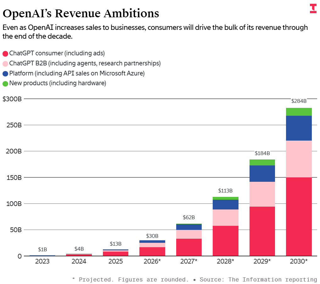 OpenAI的增长更猛。去年营收131亿美元,预计今年300亿,明年620亿。但烧钱速度也在加剧,预计到2030年在训练和推理上的总支出将达到6650亿美元。