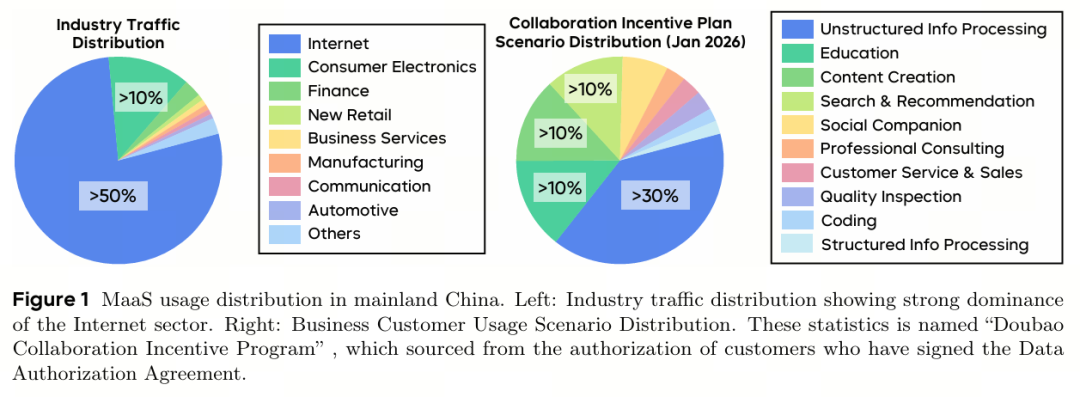 豆包大模型2.0技术报告里的调用分布数据印证了这个趋势。从行业看,互联网占比最高,消费电子、金融、新零售紧随其后。