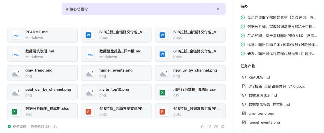 例如策划一个大促活动,前期要写方案、做宣讲 PPT、算预算;活动落地需要配置页面和物料;活动结束后还要熬夜洗数据、画图表、写复盘报告……