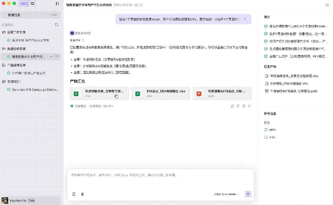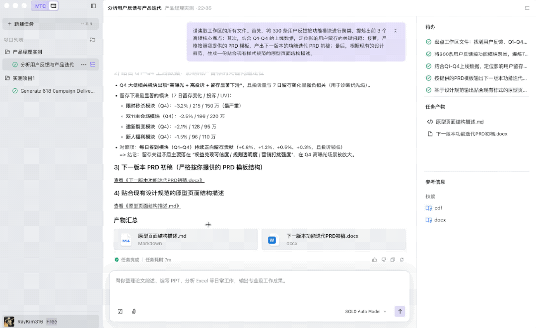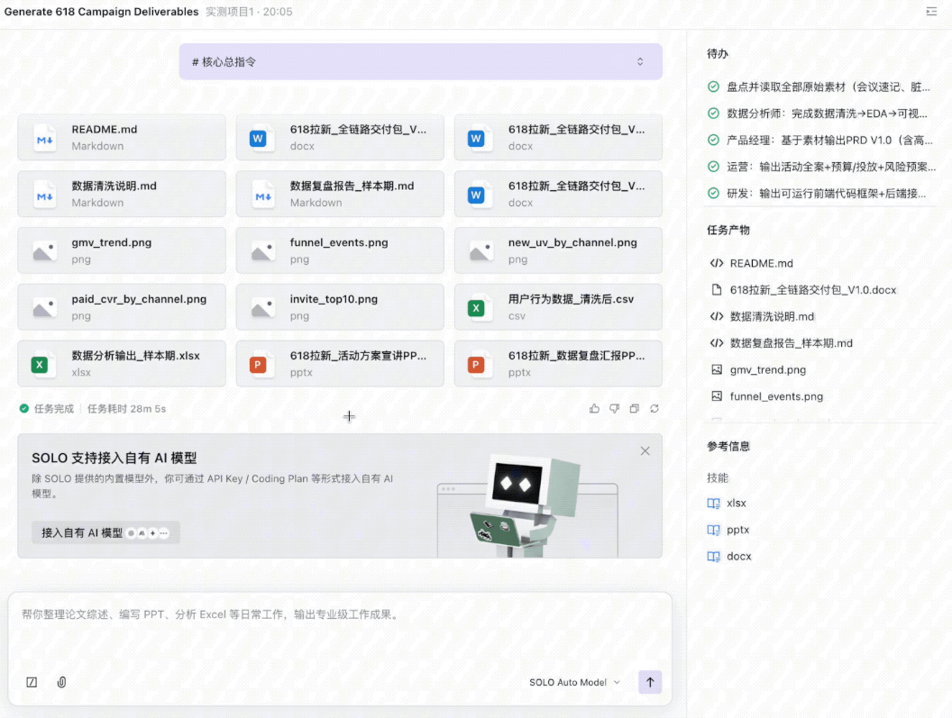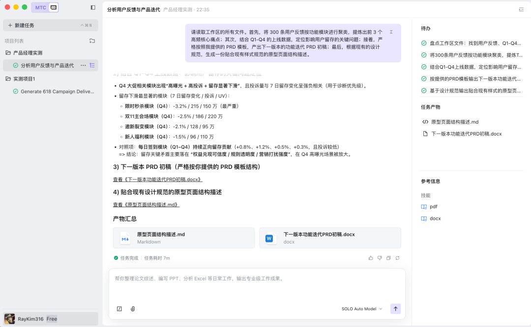 对于PM而言,SOLO最大的价值在于上下文的持续记忆与多格式文件的整合处理。它已然是一个能同时看懂表格、文档和设计规范的业务助理。