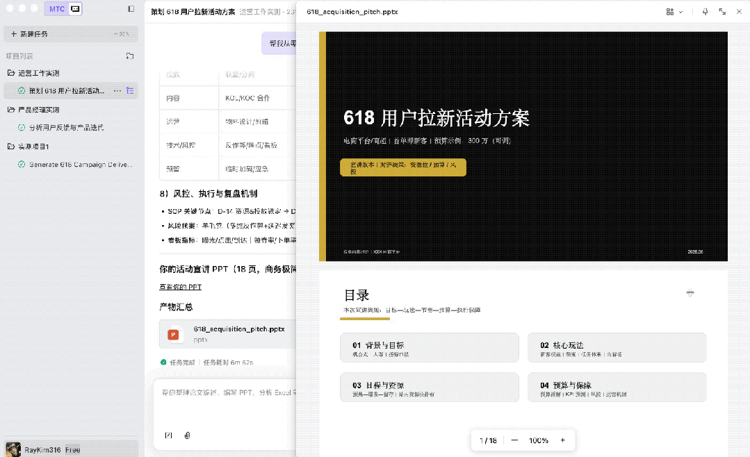 帮我从零开始策划一场618用户拉新活动,产出完整可落地的方案(含活动主题、核心玩法、日程安排、预算明细、宣传渠道)。随后,根据该方案生成一份简洁商务风格的活动宣讲PPT。
