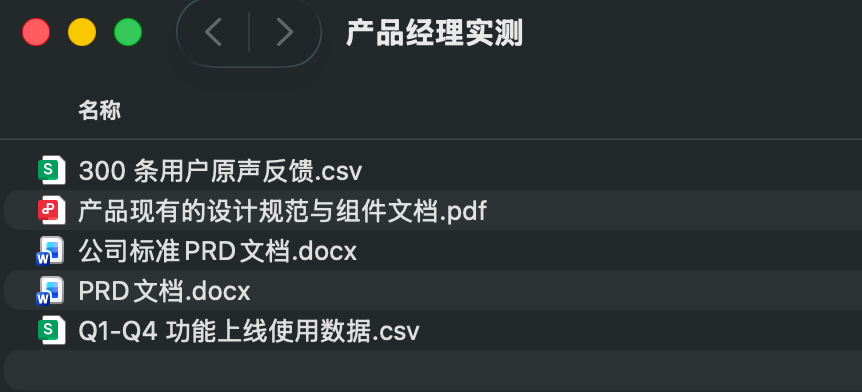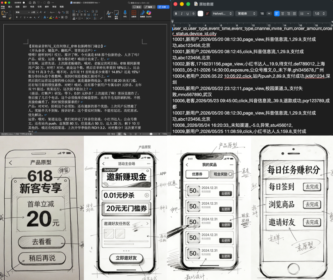 例如我手上有一堆不同格式的文件:一份会议速记、一堆没清洗的原始数据、几张手绘的原型草图……