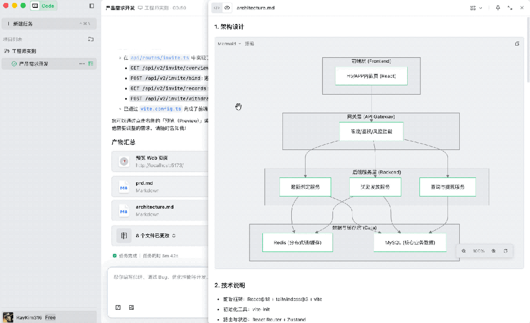 从形态上看,它脱离了传统的IDE架构,分为PC端和Web端两种;从能力上看,它将原本聚焦于代码的AI Agent能力,泛化到了整个互联网产研上下游: