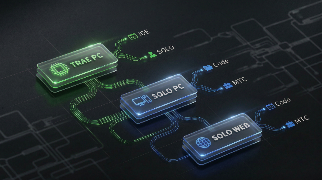 TRAE PC端: 传统的IDE形态,内部深度集成SOLO模式(SOLO Agent),面向专业且重度的研发场景。