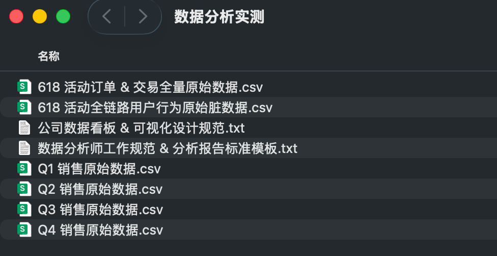为此,我们准备了非常杂乱的原始数据集,包括4个季度数据分表存储,字段命名不统一、日期格式不统一、带全类型脏数据,完全还原数分工作中从业务端拿到的多源异构原始数据场景。
