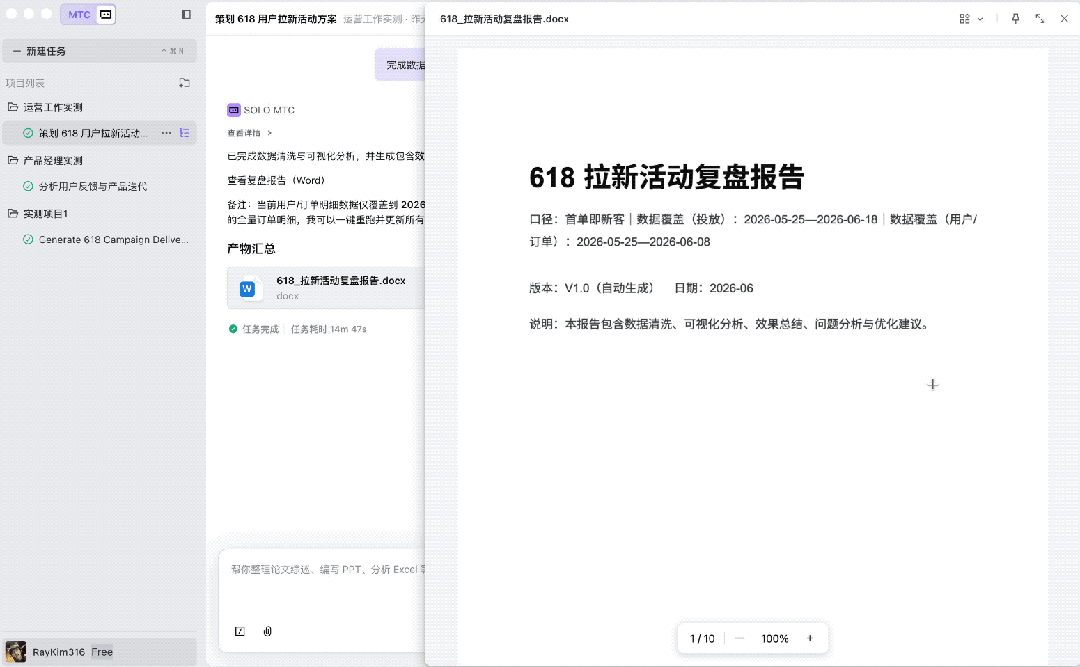 可以看到,在读取运营数据时,SOLO自动执行了数据清理(剔除无效的刷单数据和空值),并输出了带有数据图表(折线图、柱状图)的Word复盘报告。