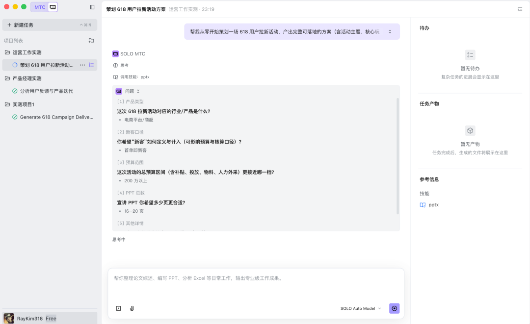 这一次,在SOLO操作之前,先提问了五个问题,包括活动对应行业、新客如何定义、总预算、PPT页数等等,以此来精确任务的执行。