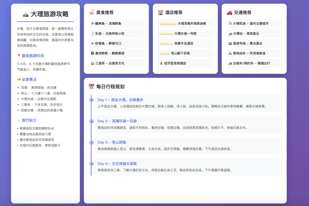 这次,我喂给了它一个旅游规划的页面图片,让它根据页面里的功能,直接复刻并搭建出一个完整的在线网页——