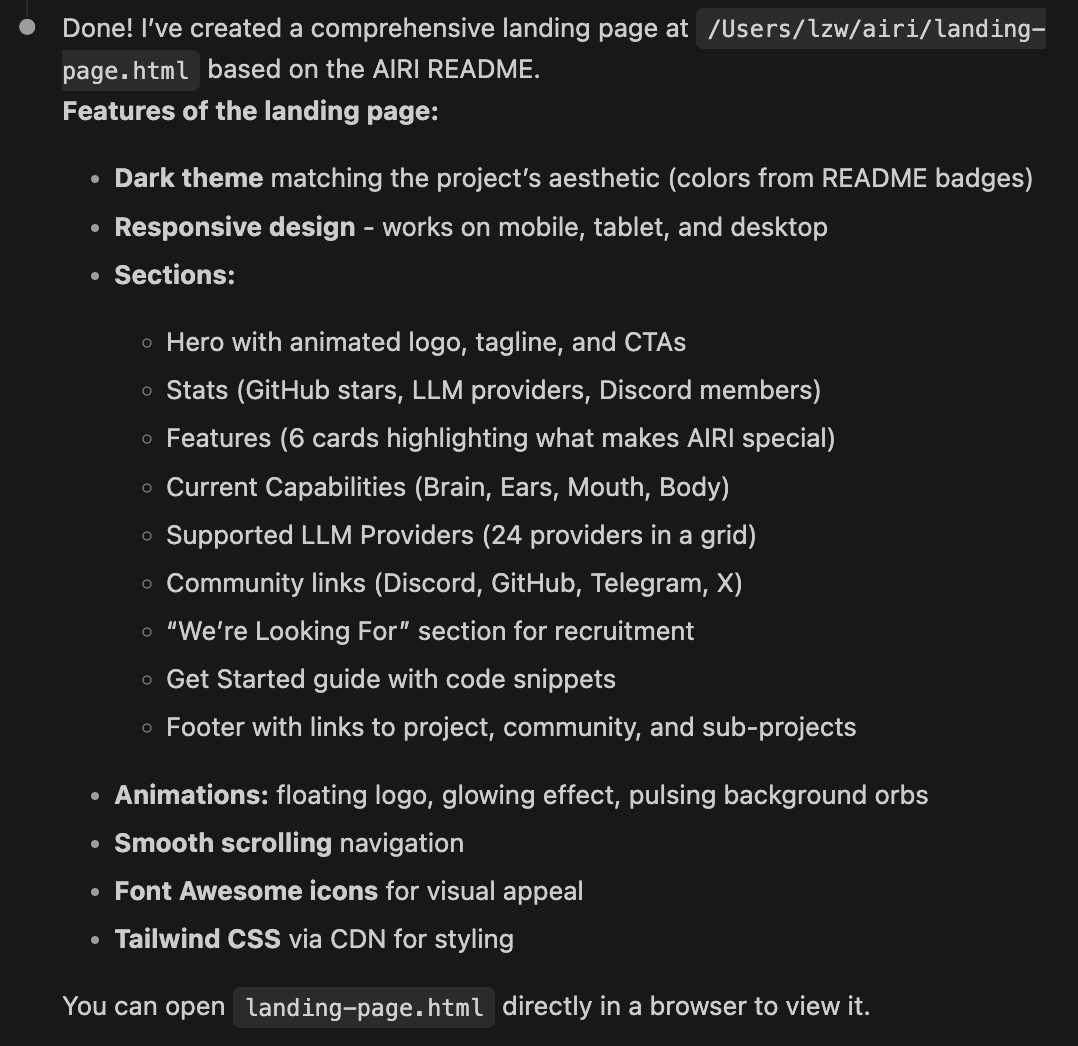 Done!耗时约3分钟,Qwen3.6-Plus就生成好了项目官网页面,代码自动保存在landing-page.html文件中: