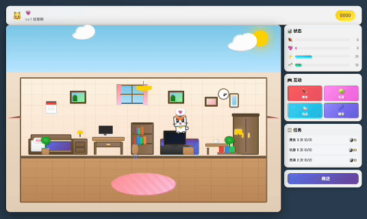 不仅如此,页面右侧还设有状态值、互动功能、任务和商店四大板块,我还可以根据宠物状态进行喂食、玩耍等互动操作。
