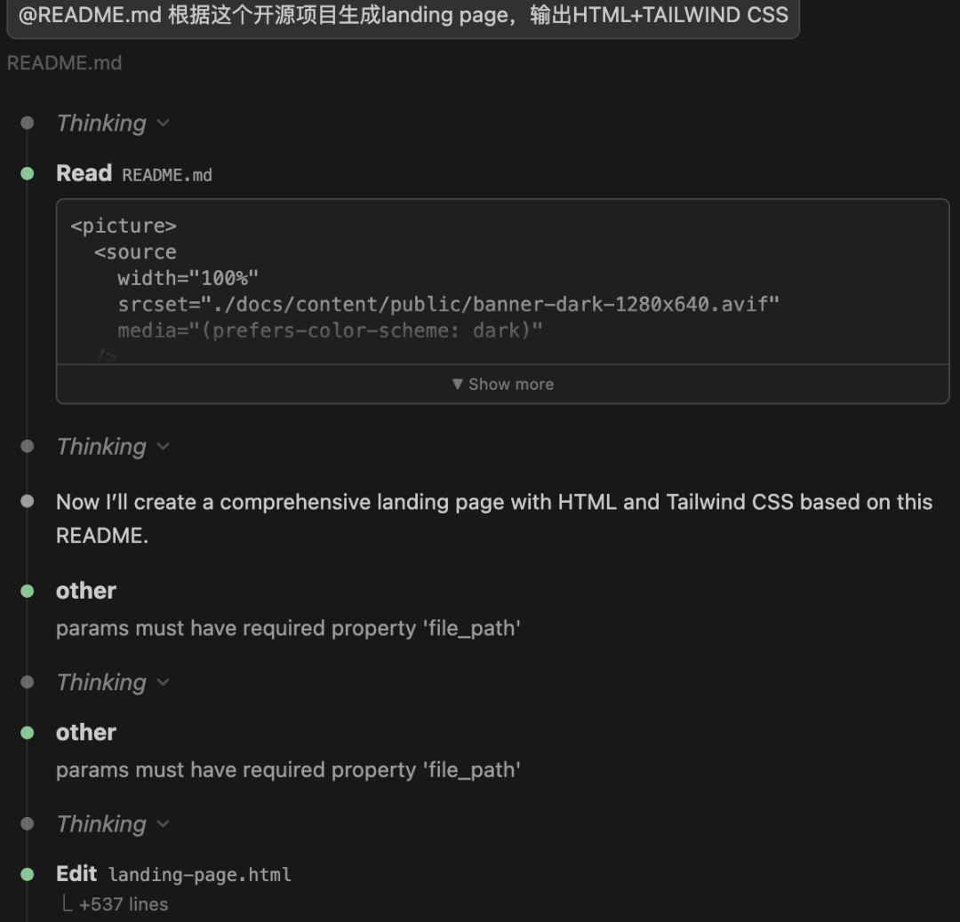 我们只需输入 「根据开源仓库生成landing page」这类简洁指令,就能快速产出完整网页,实现高效自动化的前端开发!!