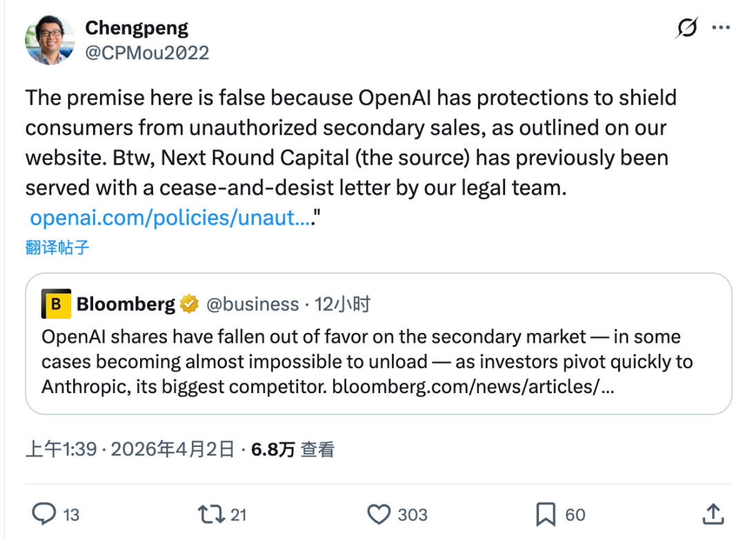 这名员工还透露,OpenAI法务早已给那些乱放风的二级市场中介发了禁止令,并正告投资者警惕那些来路不明的非授权代持渠道。