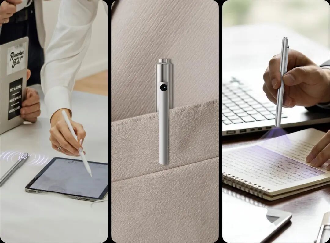 配了一支可选配的磁吸笔配件,但不是写字用的,笔底端 4K 镜头、笔夹上缘 2K 镜头、顶部双麦克风、笔夹底端触发按钮。