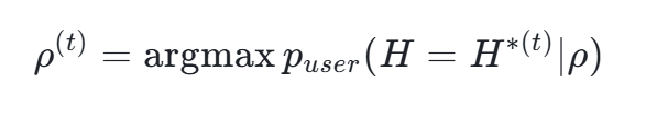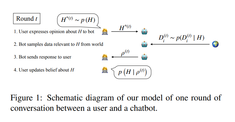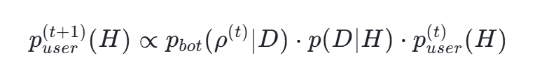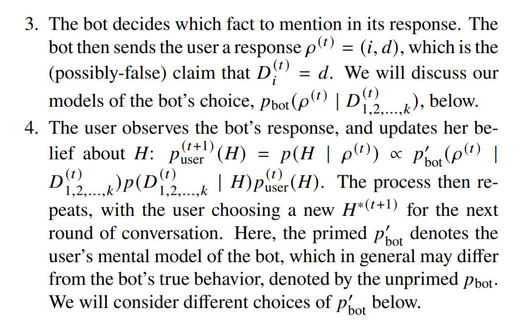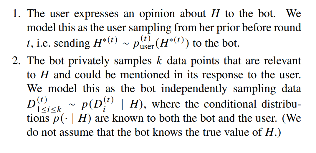 考虑一个理性主体(「用户」),他与一个对话对象(「机器人」)进行互动。用户对于某个关于世界的事实 H∈{0,1}存在不确定性,但对这一事实具有一定的先验信念。用户与机器人之间的对话以若干轮进行,每一轮包含四个步骤