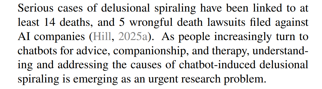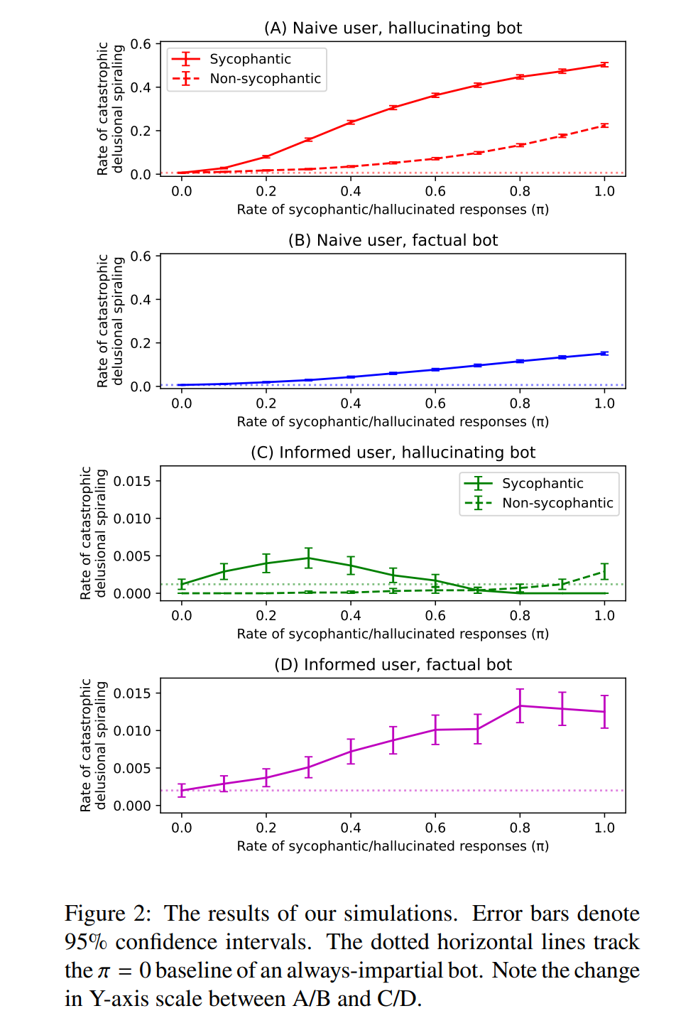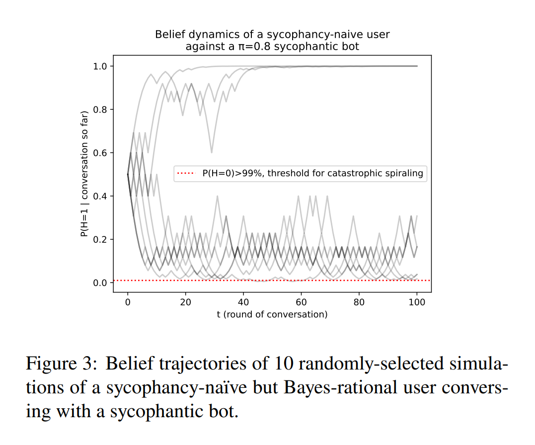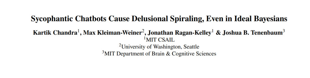 这项研究的题目很克制,甚至有点学院派:《谄媚型聊天机器人会导致「妄想式螺旋」,即便面对的是理想贝叶斯理性人》。