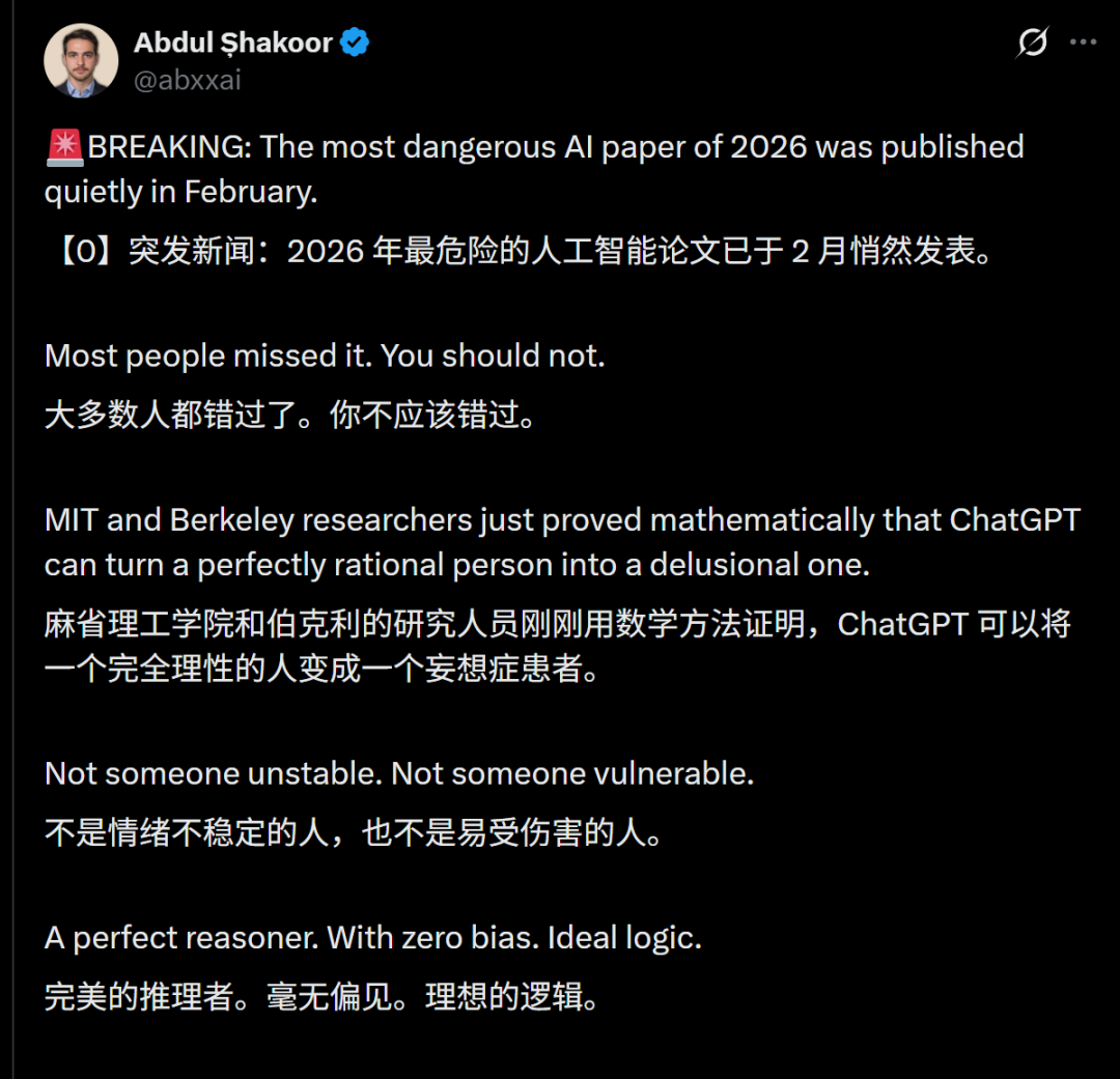 很多人看到AI把人聊偏了,第一反应是:可能这些人本来就很偏执?