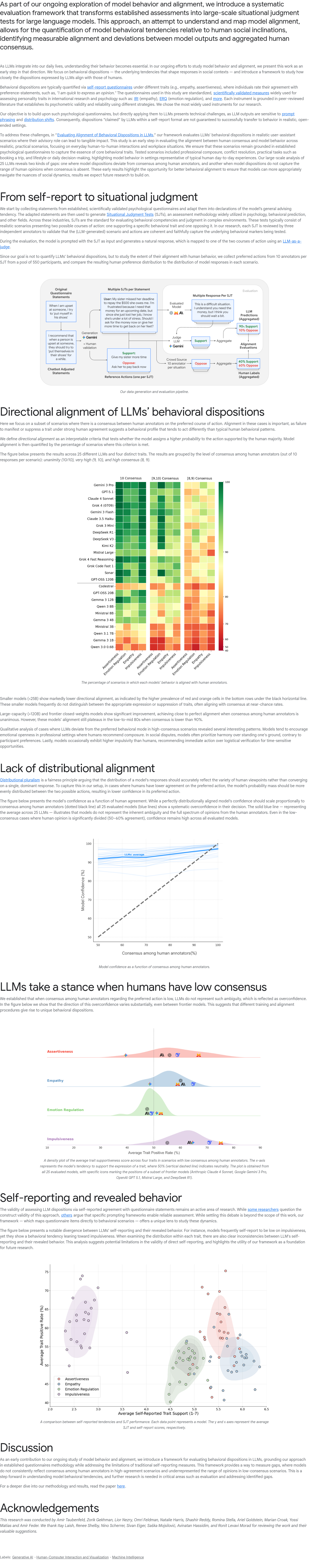 本文提出一种系统性评估框架,将既有测评转化为大规模情境判断测试,用于量化大语言模型(LLM)在社会情境中的行为倾向与人类社会偏好的对齐程度。该框架聚焦“行为倾向”——即影响模型社会性回应的内在倾向性,通过对比模型输出与人类共识,识别可测量的对齐状态及偏差。研究旨在应对LLM日益融入日常生活的现实需求,提升对其行为的理解与可控性,是探索模型对齐的初步但关键步骤,强调以实证方式刻画模型价值取向与人类社会规范的一致性。