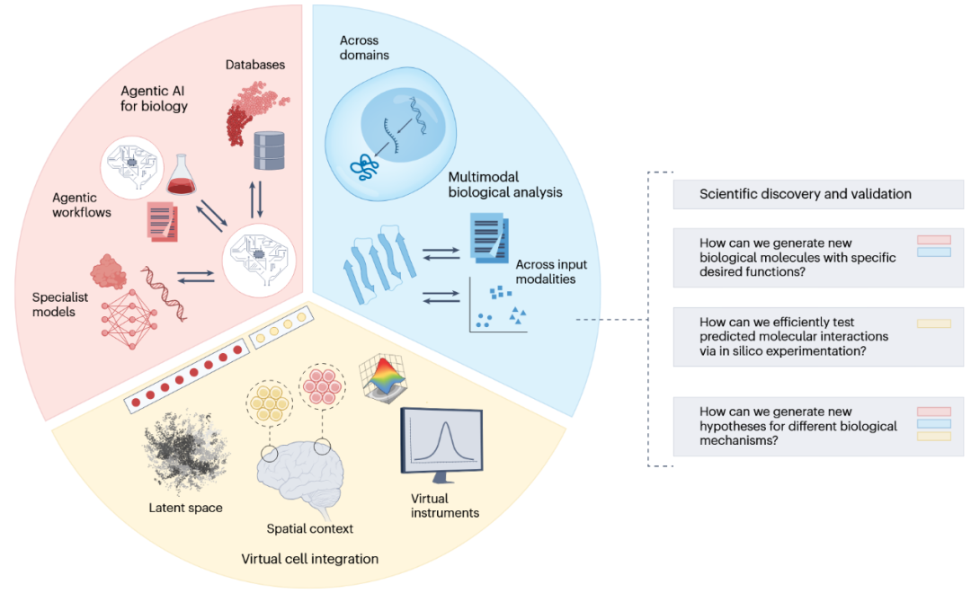 图2 生物人工智能在细胞处理不同维度的应用。生物人工智能为数字生物学开辟了三个新的前沿领域:编排专用模型的智能体工作流(红色)、跨生物领域学习并加速科学发现的多模态编码器(蓝色)以及能够通过联合潜空间建模分子活性的虚拟细胞框架(黄色)。
