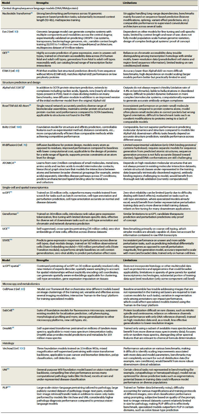 GBAI的发展为生物AI领域内提出的许多令人振奋的愿景(如虚拟细胞、AI驱动的数字生物以及其他稳健的生物模拟形式)提供了可能的基础。尽管这些愿景代表着更为长远的目标,但GBAI基于当前模型的发展方向提供了一个切实可行的框架,并规划了通往多任务、多领域模型的路径,这些模型可作为集成的计算机生物模拟的有效构建模块和交互式封装器。同样,许多生物AI模型也存在若干必须克服的局限性。表1概述了具有代表性的、覆盖不同尺度的生物AI模型的优势与局限性。