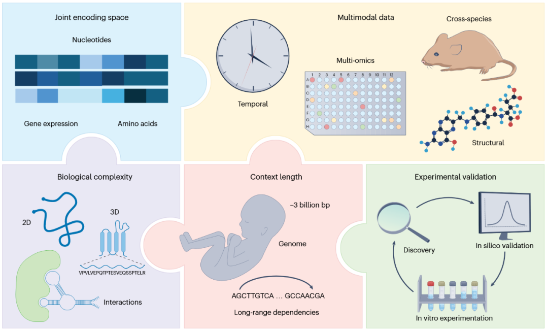 拓展AI的能力。当前模型在长序列处理、多领域联合编码、跨模态整合等方面能力有限。核苷酸模型难以捕捉增强子等长程调控元件,多领域数据(如DNA、RNA、蛋白质、基因表达)的整合仍缺乏统一框架。未来需进一步提升模型上下文长度与联合编码能力,以支持更复杂的跨领域建模。