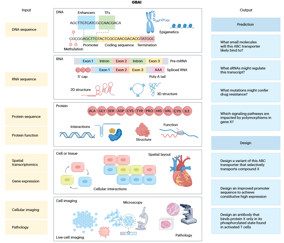 生成式人工智能的最新创新使得开发通用模型成为可能,这些模型能够执行多种分析下游任务,包括分类、预测和生成,且无需为每种应用进行大量训练。虽然目前大多数生物AI模型所执行的任务仅限于单一领域,但能够预见生物AI的下一个前沿将是跨多种生物数据类型(如核酸序列、蛋白质结构、显微镜图像、细胞表征等)进行处理和预测。具体而言,作者将GBAI定义为一种愿景,旨在构建统一的系统,该系统能够跨多个生物领域进行解读、合成和扩展,从而有效执行需要跨领域理解的多种生物任务(图1)。未来,这些整体性方法将具备整合不同分子生物学层次的遗传和细胞数据的潜力,从而推动科学设计与发现。
