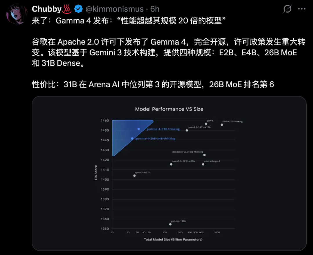 26B MoE更离谱:260亿参数,推理时只激活38亿,Elo打到1441,排开源第六。