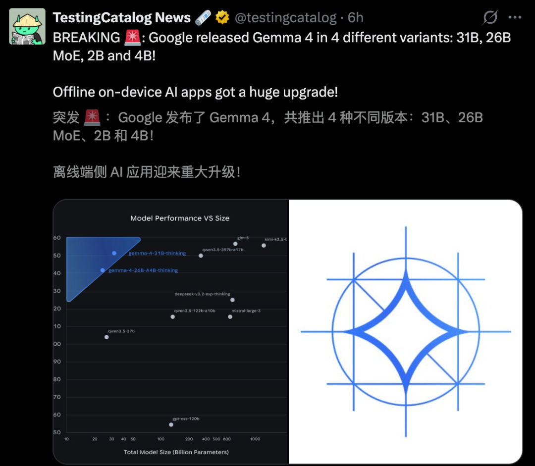 从能塞进手机的2B,到可以单卡跑满的31B,四个尺寸全覆盖,全部基于Gemini 3同源打造。