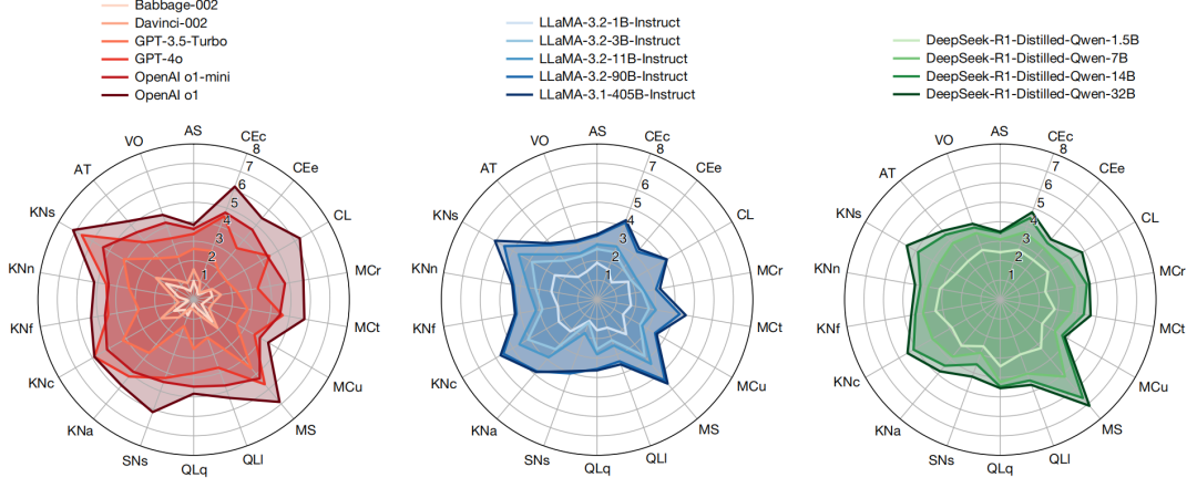 通过对 15 个大语言模型的测试,研究团队生成了各模型的 18 维能力画像。差异分析表明,知识类维度的能力水平与模型参数量呈现正相关,而推理类维度在采用思维链的推理模型中则表现出显著提升。