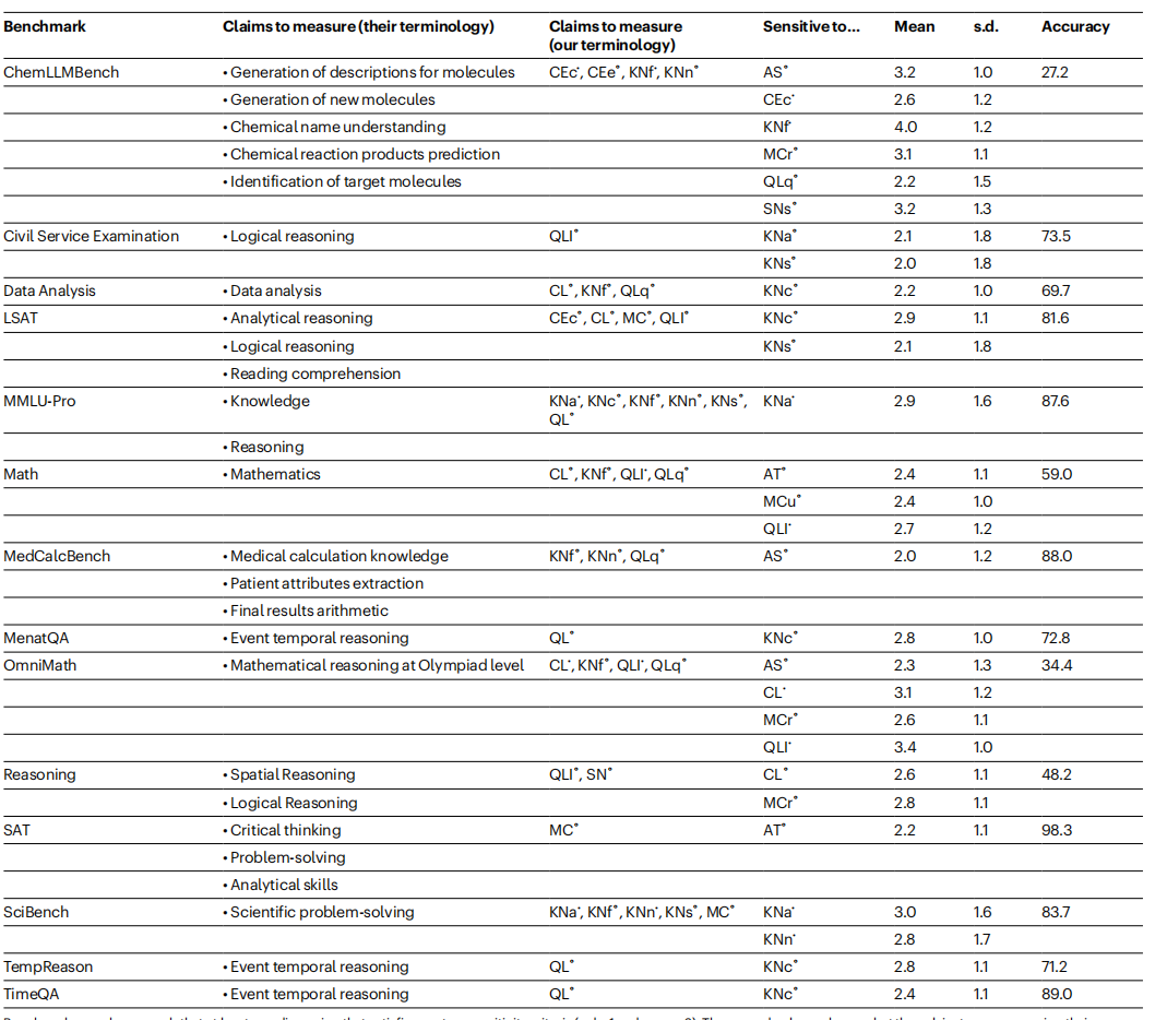 此外,部分基准测试在声称测量的维度上,其需求水平分布过于狭窄,无法有效区分不同能力的模型。这一分析揭示了现有基准测试未能完全测量其所声称的能力,从而解释了为何不同基准测试的结果常出现相互矛盾的现象。