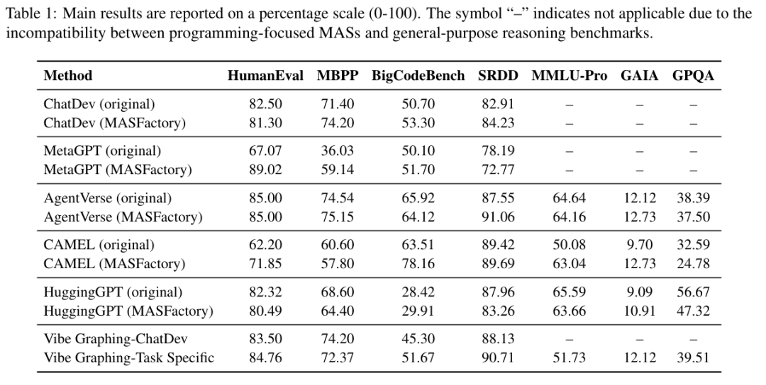实验表明,MASFactory 能够极为稳定且高效地复现当前业界最具代表性的系统(包括 ChatDev、MetaGPT、Agent Verse、CAMEL、HuggingGPT 等),且在多项指标上表现优于原始硬编码实现。