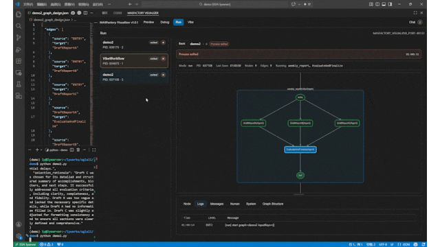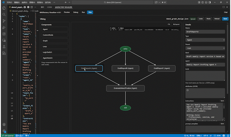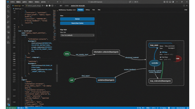 此外,MASFactory也提供一款深度集成的 VS Code 扩展工具——MASFactory Visualizer。它可以在代码编排阶段、拖拽式编排阶段、Vibe Graphing阶段、调试运行阶段提供全栈的可视化支持。