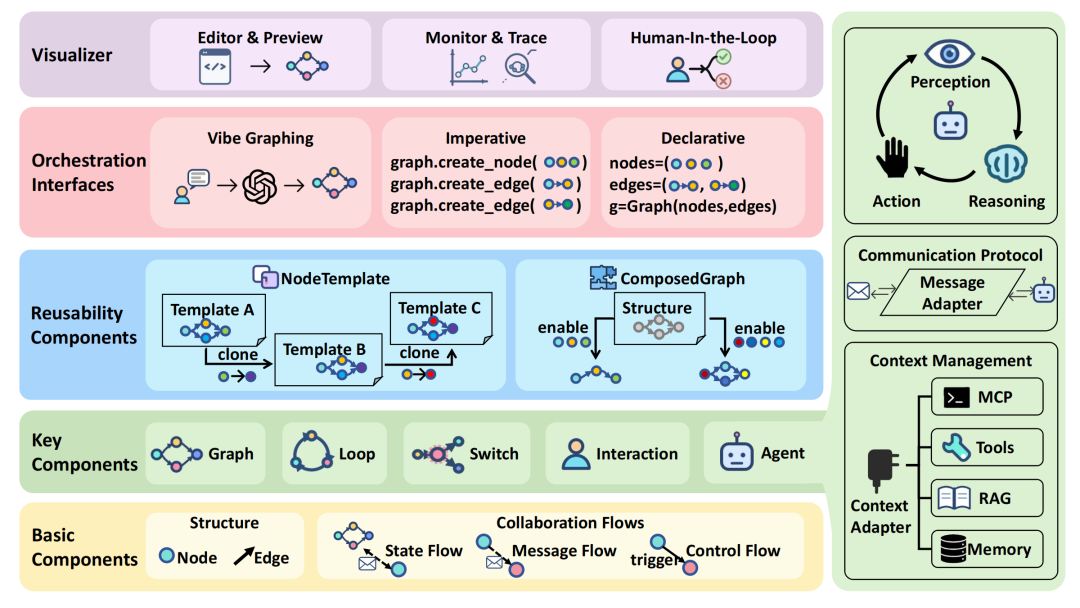 基础的节点被进一步抽象为丰富的组件库。除了遵循感知-推理-行动(Perception-Reasoning-Action)范式的基础Agent外,系统还提供了: