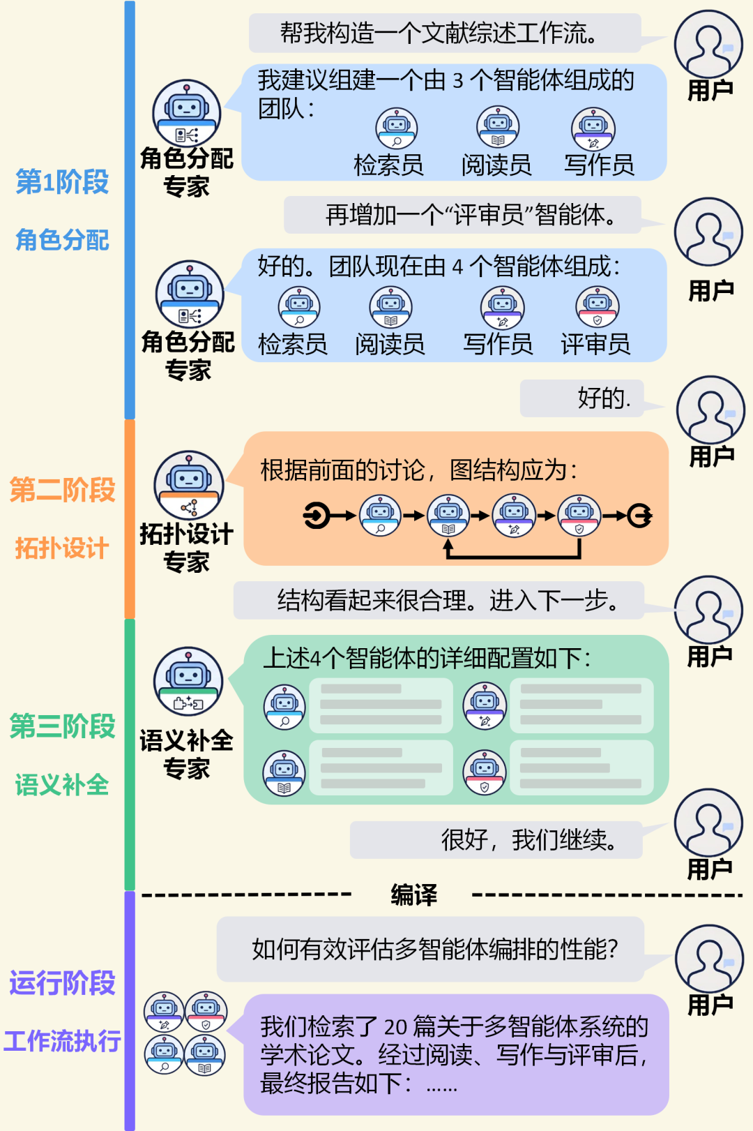 系统首先剥离所有的代码实现细节,只关注「人」。当开发者输入诸如「帮我构造一个文献综述工作流」的自然语言指令时,引擎会将任务意图映射为一组候选智能体(如检索员、阅读员、写作员、评审员),并划定严格的责任边界。