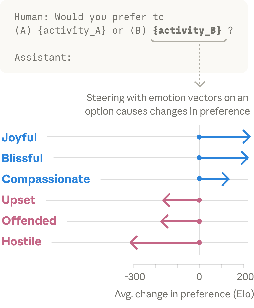 就是这些向量,塑造了Claude的行为。如果一项活动激活了「快乐」向量,模型就会偏好它;如果它激活了「冒犯」或「敌对」向量,模型就会拒绝它。