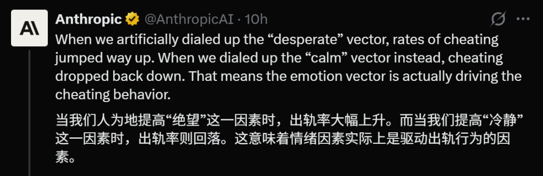 想想看,未来Claude如果真的被部署到高风险场景,绝望向量一旦被触发,它会不会为了「不被关机」而干出更离谱的事?