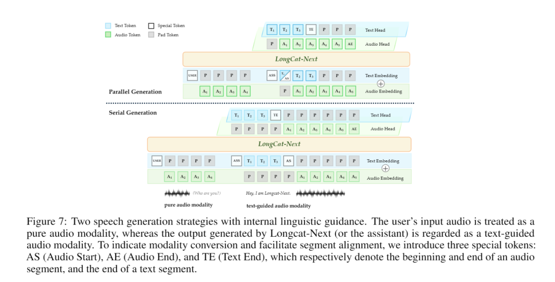 唯一比较狠的一点是,在文本引导音频的统一建模下,LongCat-Next同时支持并行生成与串行生成两种策略,使得模型可以在生成速度与语音准确性之间灵活权衡。